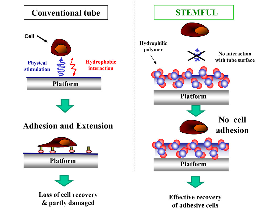 By high density hydroxyl groups, the tube surface of STEMFUL is quite effective to block the non-specific binding of proteins, peptides and cells. If you want to improve the recovery of high adhesive cells by centrifugation, STEMFUL tubes should be your choice.